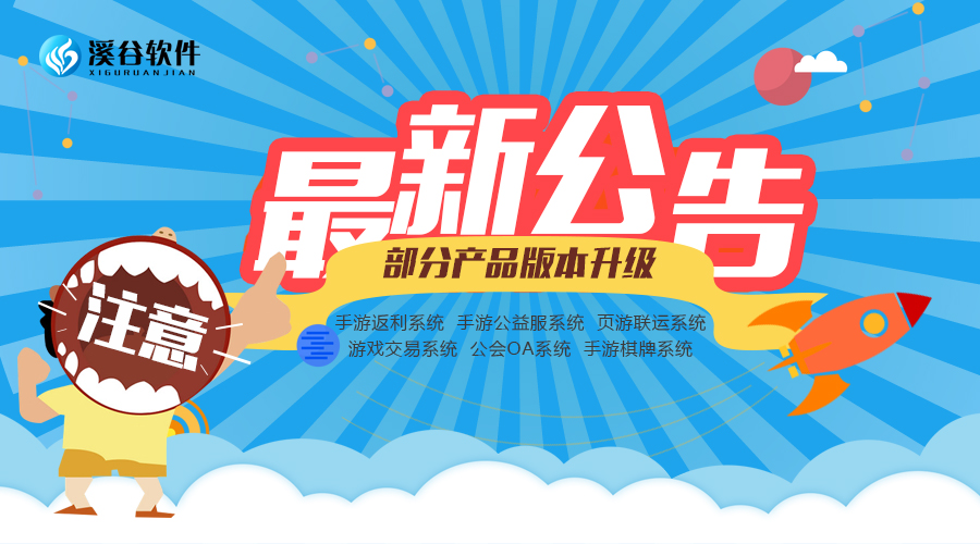 尊敬的溪谷用户: 衷心感谢您长期以来对溪谷软件产品的信赖和支持! 为给大家提供更具竞争力的解决方案,带来更好的产品体验。经公司研究决定,我司将于今日对手游返利系统、手游公益服系统、页游联运系统、游戏交易系统、公会OA系统、手游棋牌系统六款产品进行全面升级,升级期间上述产品将做下线处理,溪谷软件全体员工将不遗余力做好此次产品优化升级,升级完成时间将另行通知。