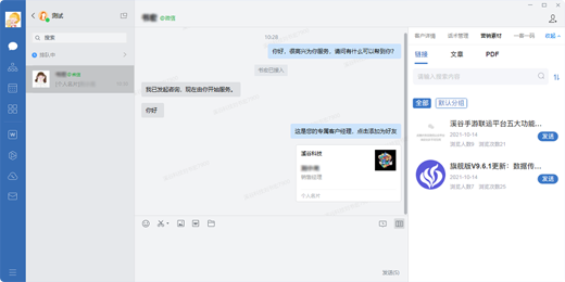 员工在企业微信工作台接待,会话过程中接待人员可推荐员工名片,引导客户加好友。