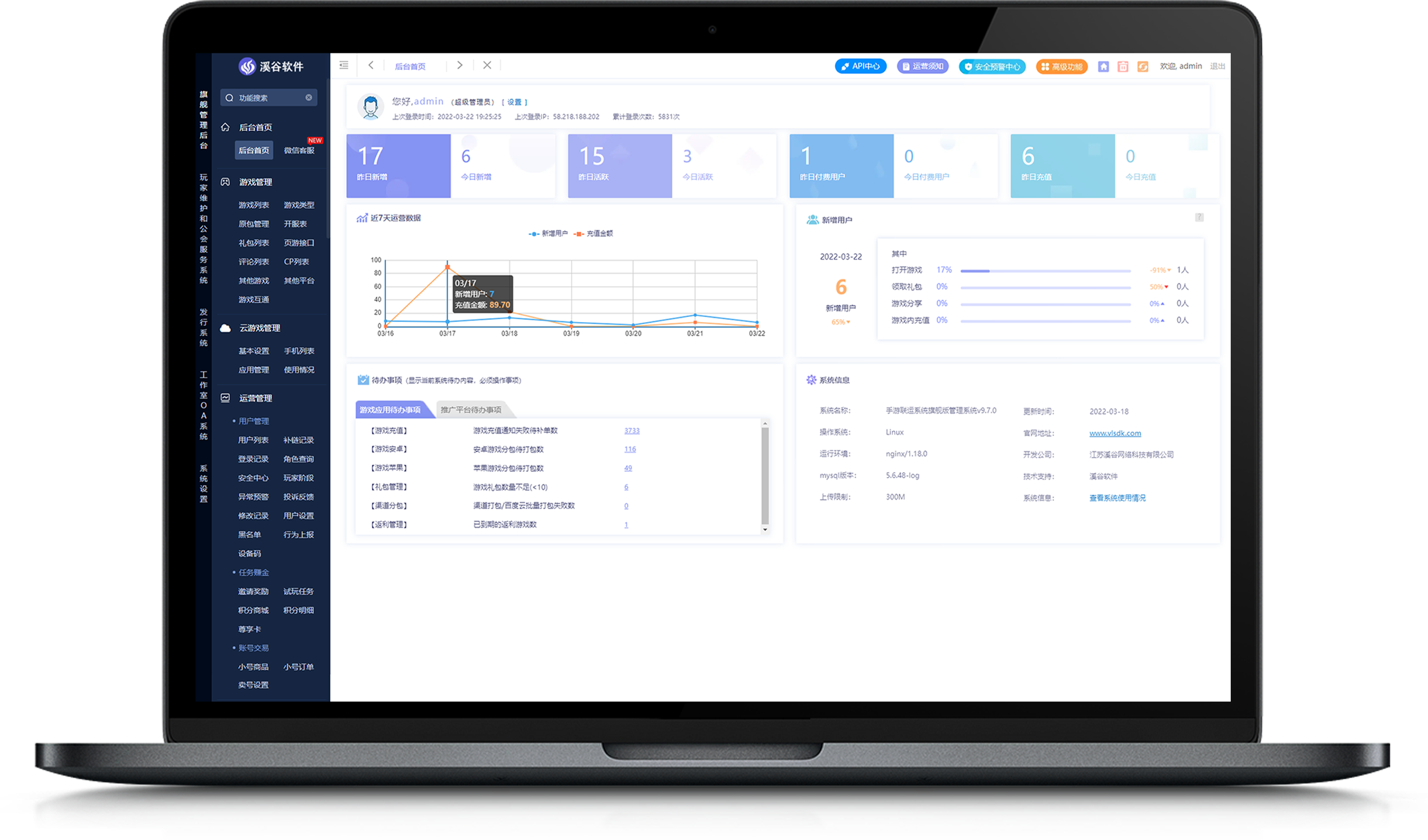 组成模块 后台首页、游戏管理、运营管理、数据报表、财务管理、推广平台、站点管理