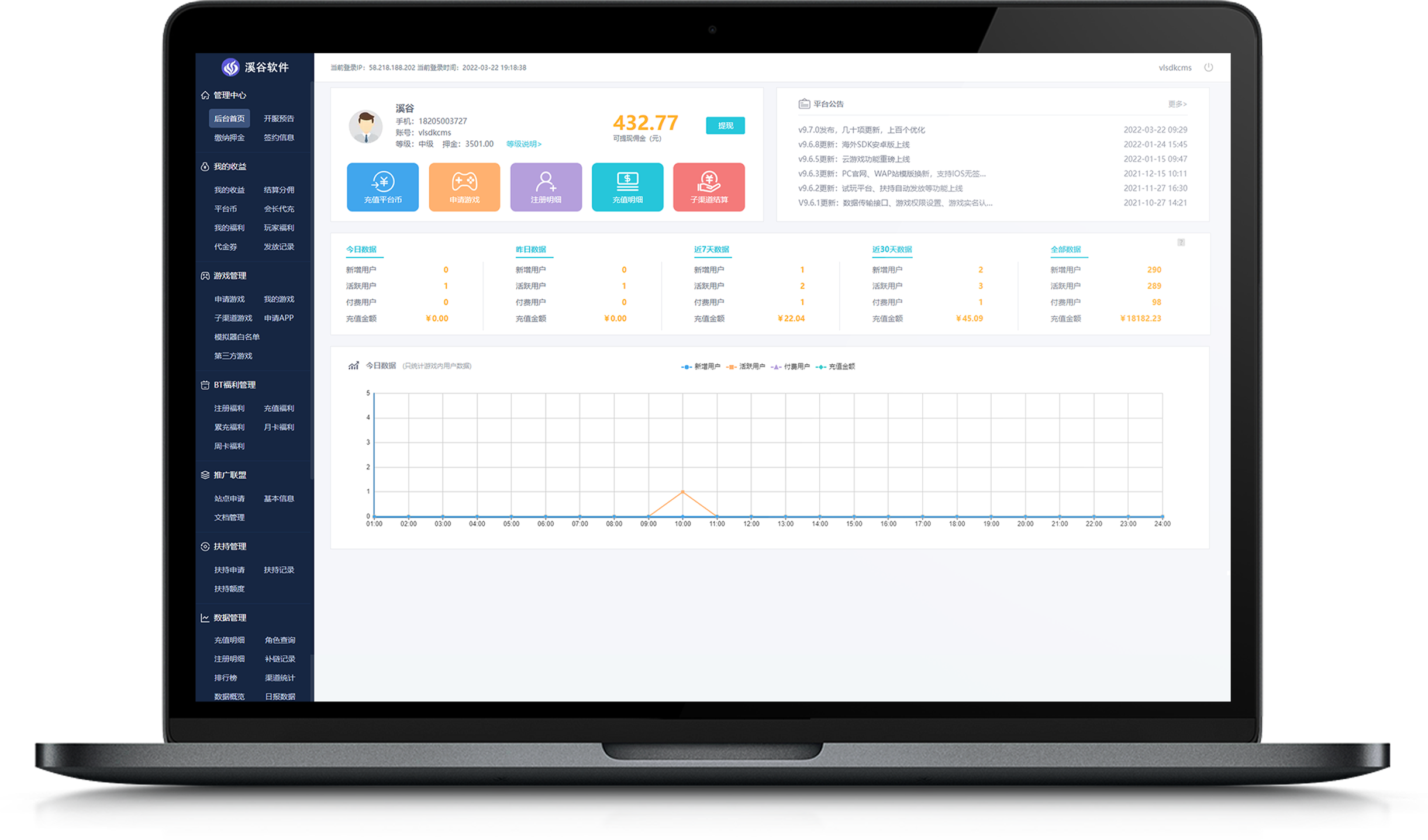• 开放平台:可供CP进行游戏配置、合同签约、数据查看、分佣结算;